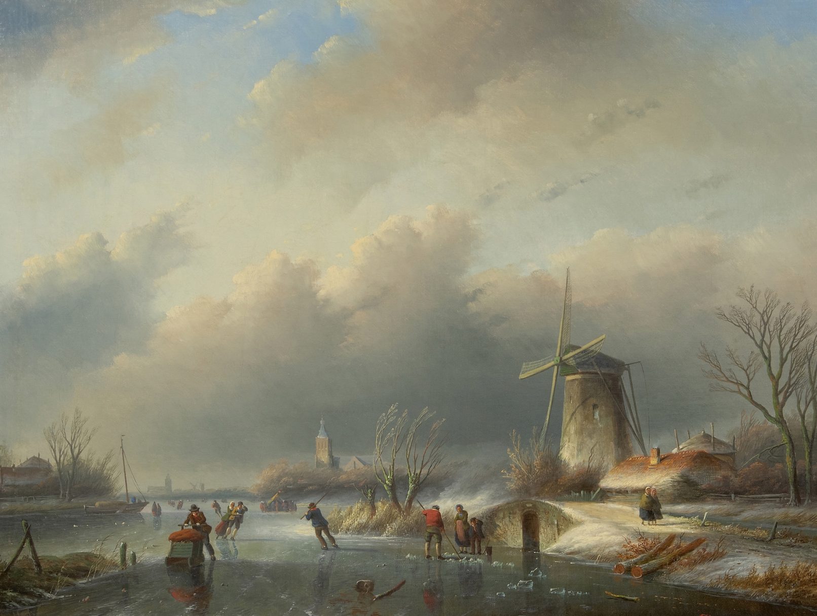 Jan Jacob Spohler (Nederhorst den Berg 1811 – 1866 Amsterdam) was trained as a painter in the studio of the then noted history painter Jan Willem Pieneman. He gradually applied himself to painting detailed Dutch summer and winter landscapes. These had all the ingredients that made such scenes so popular in the 19th century: tranquil summer river views with sailing craft and rowing boats, people busily engaged, or cold winter scenes of reflective ice, leafless trees, skaters and shared conviviality around a refreshment stall.