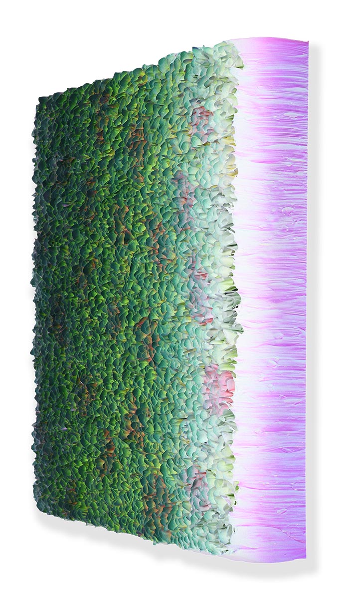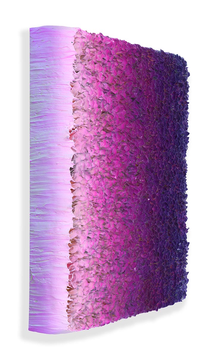 Zhuang Hong Yi was born in 1962 in Sichuan, China. He received his artistic education at the prestigious Sichuan Fine Arts Institute in Chongqing before moving to Groningen to study at the Minerva Academy. Zhuang’s ‘Flowerbeds’ are crafted from delicate hand-cut pieces of painted rice paper, which the artist has bent and folded into hundreds of tiny buds. A meditation on color, nature and form. The source of inspiration for these collages are the endless, colourful flower bulb fields that Zhuang saw glide by below him on his first flight to The Netherlands. The almost sculptural three-dimensionality makes his work both painting and object.
