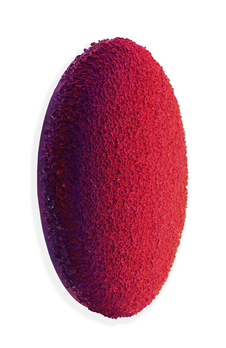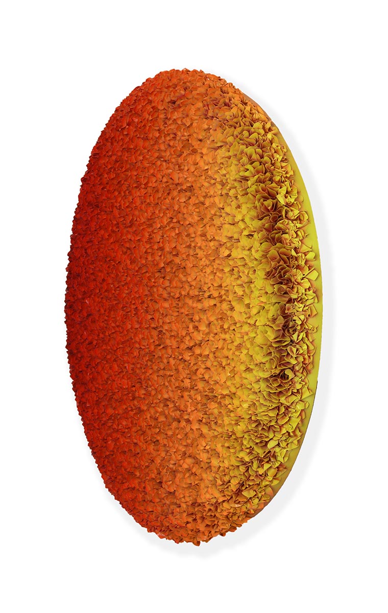 Zhuang Hong Yi was born in 1962 in Sichuan, China. He received his artistic education at the prestigious Sichuan Fine Arts Institute in Chongqing before moving to Groningen to study at the Minerva Academy. Zhuang’s ‘Flowerbeds’ are crafted from delicate hand-cut pieces of painted rice paper, which the artist has bent and folded into hundreds of tiny buds. A meditation on color, nature and form. The source of inspiration for these collages are the endless, colourful flower bulb fields that Zhuang saw glide by below him on his first flight to The Netherlands. The almost sculptural three-dimensionality makes his work both painting and object.