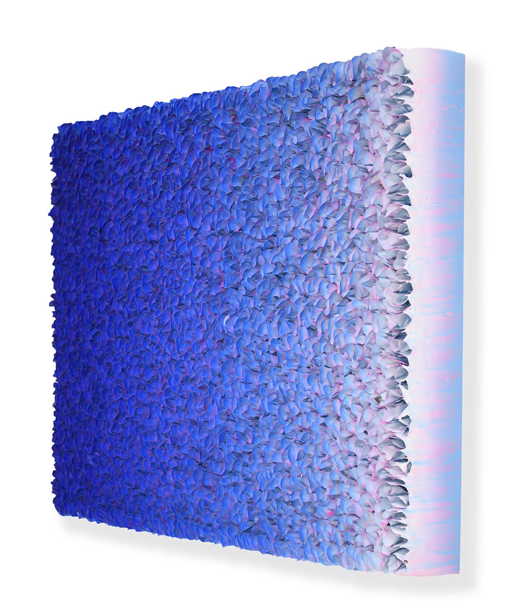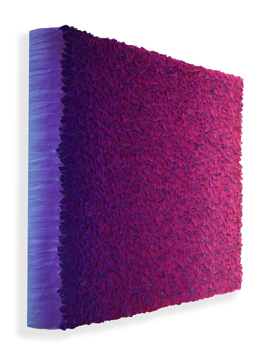 Zhuang Hong Yi was born in 1962 in Sichuan, China. He received his artistic education at the prestigious Sichuan Fine Arts Institute in Chongqing before moving to Groningen to study at the Minerva Academy. Zhuang’s ‘Flowerbeds’ are crafted from delicate hand-cut pieces of painted rice paper, which the artist has bent and folded into hundreds of tiny buds. A meditation on color, nature and form. The source of inspiration for these collages are the endless, colourful flower bulb fields that Zhuang saw glide by below him on his first flight to The Netherlands. The almost sculptural three-dimensionality makes his work both painting and object.